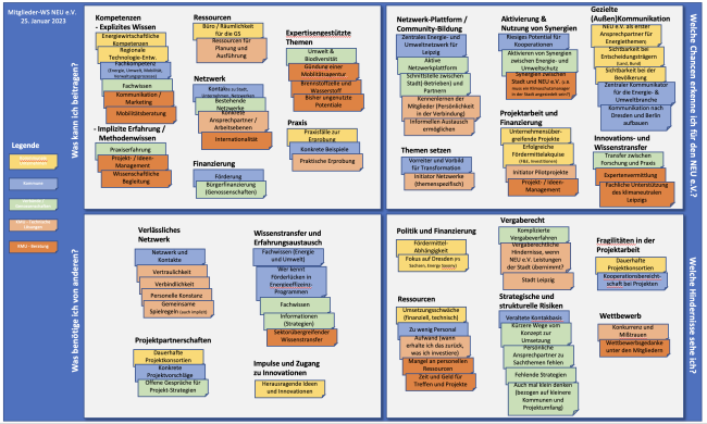 Zum ersten Mitglieder-Workshop im Januar 2023 wurden die Vereinsmitglieder mit der Bitte eingeladen, sich darüber Gedanken zu machen, warum sie Mitglied sind, wohin wir uns als Netzwerk entwickeln und was wir erreichen wollen. Über die Hälfte der Mitglieder nahmen aktiv teil. Im Workshop wurde erarbeitet, was die Mitgliedsunternehmen jeweils zum Vereinsleben beitragen können, was sie von anderen benötigen und wo sie Chancen und Hindernisse sehen. Die Ergebnisse wurden nach den Gruppen kommunale Unternehmen, Kommune, Verbände / Genossenschaften, beratende KMU und KMU für technische Lösungen geclustert. Die Fülle an Möglichkeiten wurde damit nicht nur spür- sondern auch sichtbar. Im Ergebnis hat der Verein nicht nur eine Aktivierung der Mitglieder erzielt, sondern das neue Format der Ideenworkshops beschlossen und den Weg für die regionale Erweiterung auf Mitteldeutschland geöffnet. Darüber hinaus zeigte sich, dass die Marke „Energiemetropole Leipzig“ nicht mehr zu den Zielen des Netzwerkes passt.